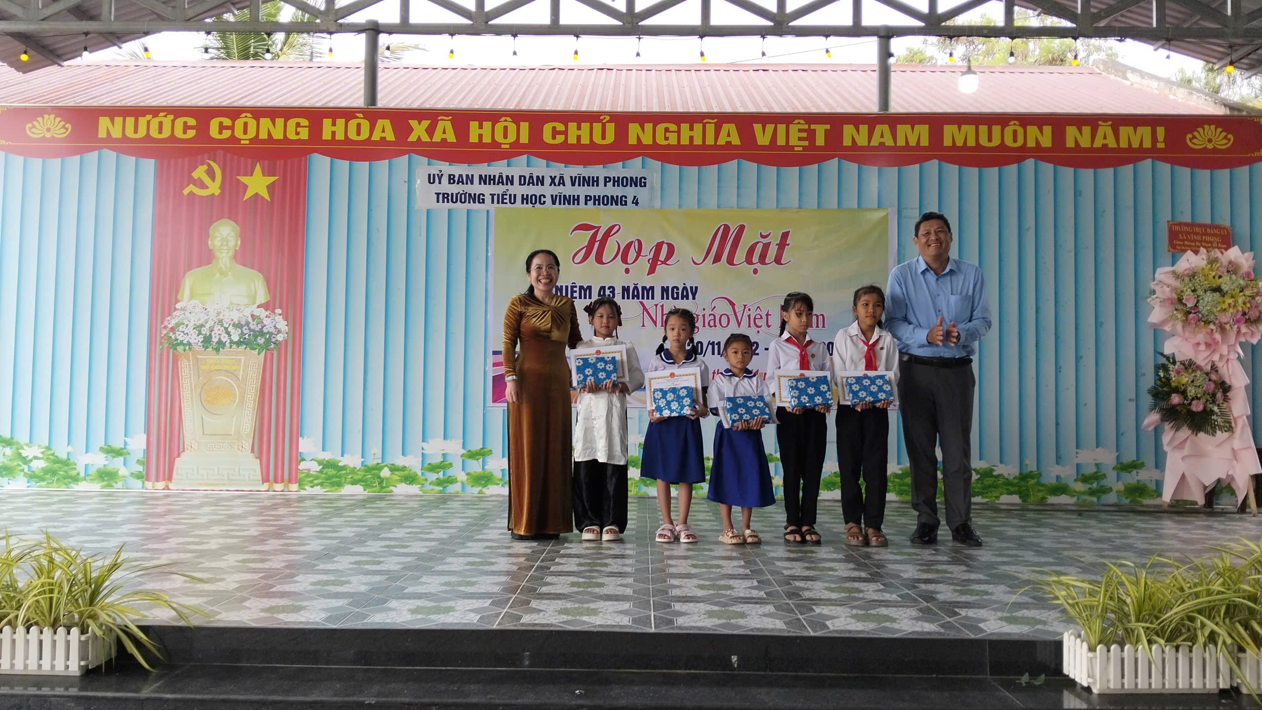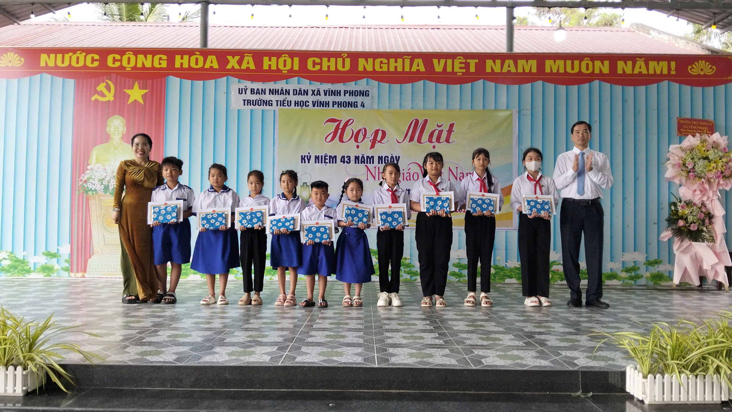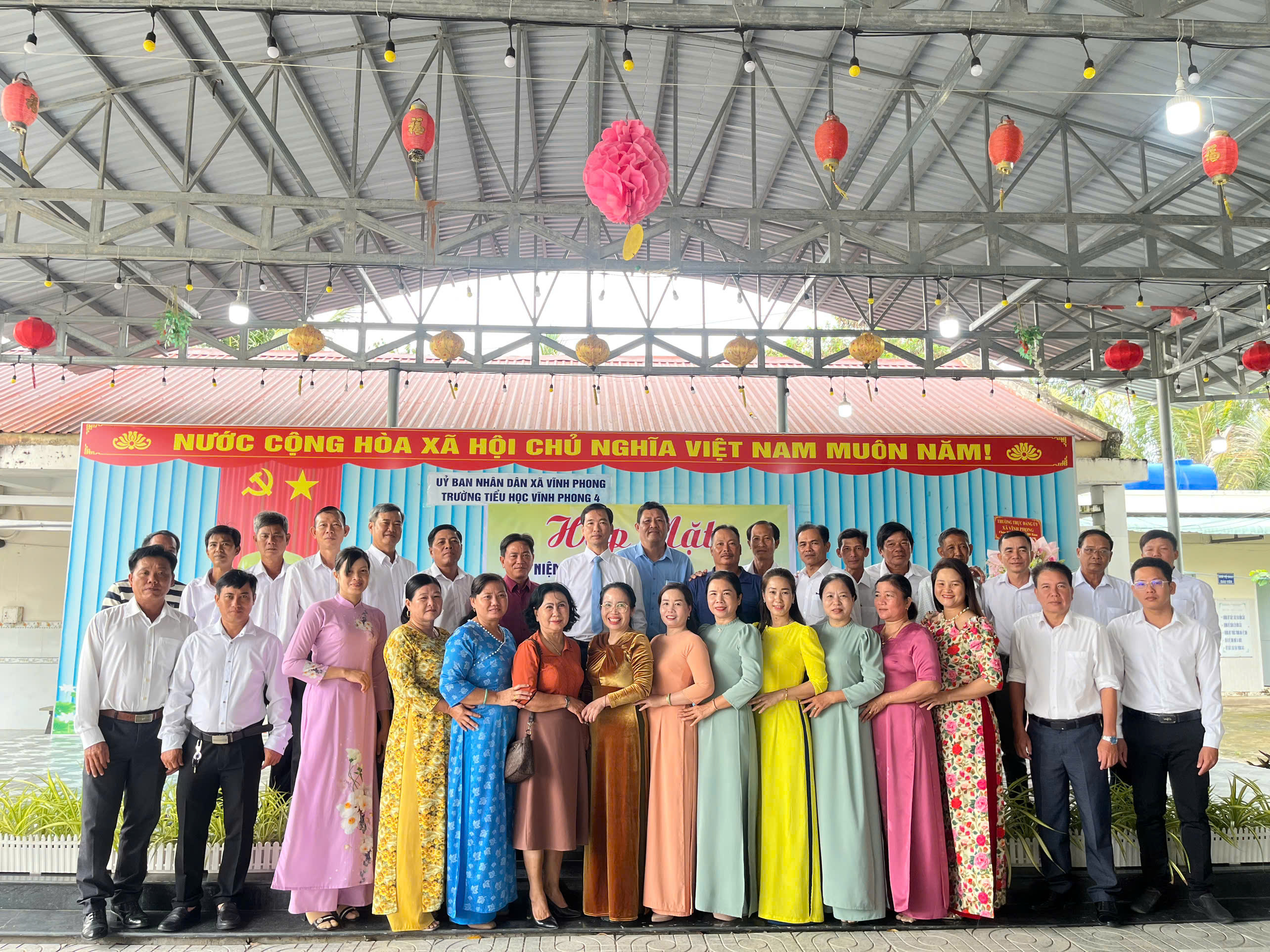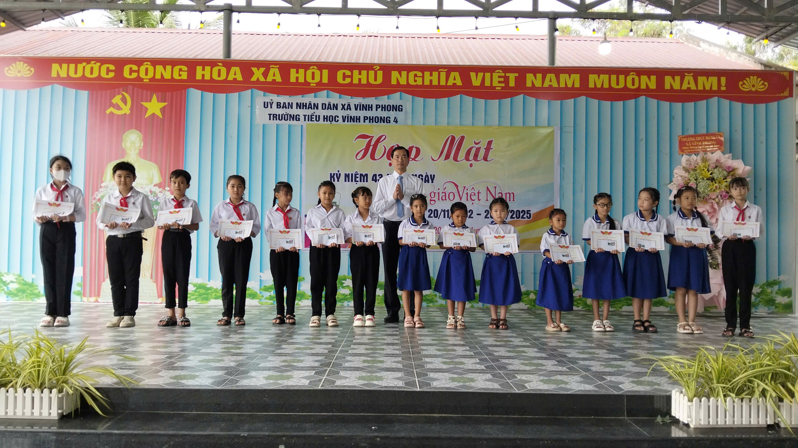 Trong không khí vui tươi, phấn khởi của cả nước hướng về ngày Nhà giáo Việt Nam 20/11, hôm nay, ngày 20/11/2025 trường Tiểu học Vĩnh Phong 4 long trọng tổ chức buổi họp mặt kỷ niệm 43 năm ngày nhà giáo Việt Nam (20/11/1982 – 20/11/2025). Về dự buổi họp mặt có sự hiện diện của Ông: Trần Văn Thanh Hà, Phó Bí thư Thường trực Đảng uỷ, chủ tịch Hội Đồng Nhân Dân xã Vĩnh Phong; Ông: Nguyễn Thanh Bình, Đảng uỷ viên, Phó Chủ tịch Uỷ ban Mặt Trận Tổ Quốc Việt Nam xã, kiêm Chủ tịch Hội nông dân xã Vĩnh Phong; Cô: Nguyễn Hoài Thu – Bí thư chi bộ-Hiệu trưởng nhà trường; Đại diện lãnh đạo ấp Cạnh Đền 2, ấp Cạnh Đền 3, ấp Căn Cứ, ấp Thị Mỹ; Đại diện hội Phụ huynh học sinh và phụ huynh học sinh các khối lớp; Các thầy giáo, cô giáo là cựu giáo chức trường TH Vĩnh Phong 4; Cùng toàn thể quý thầy giáo, cô giáo, và 25 em học sinh tiêu biểu các khối lớp.
