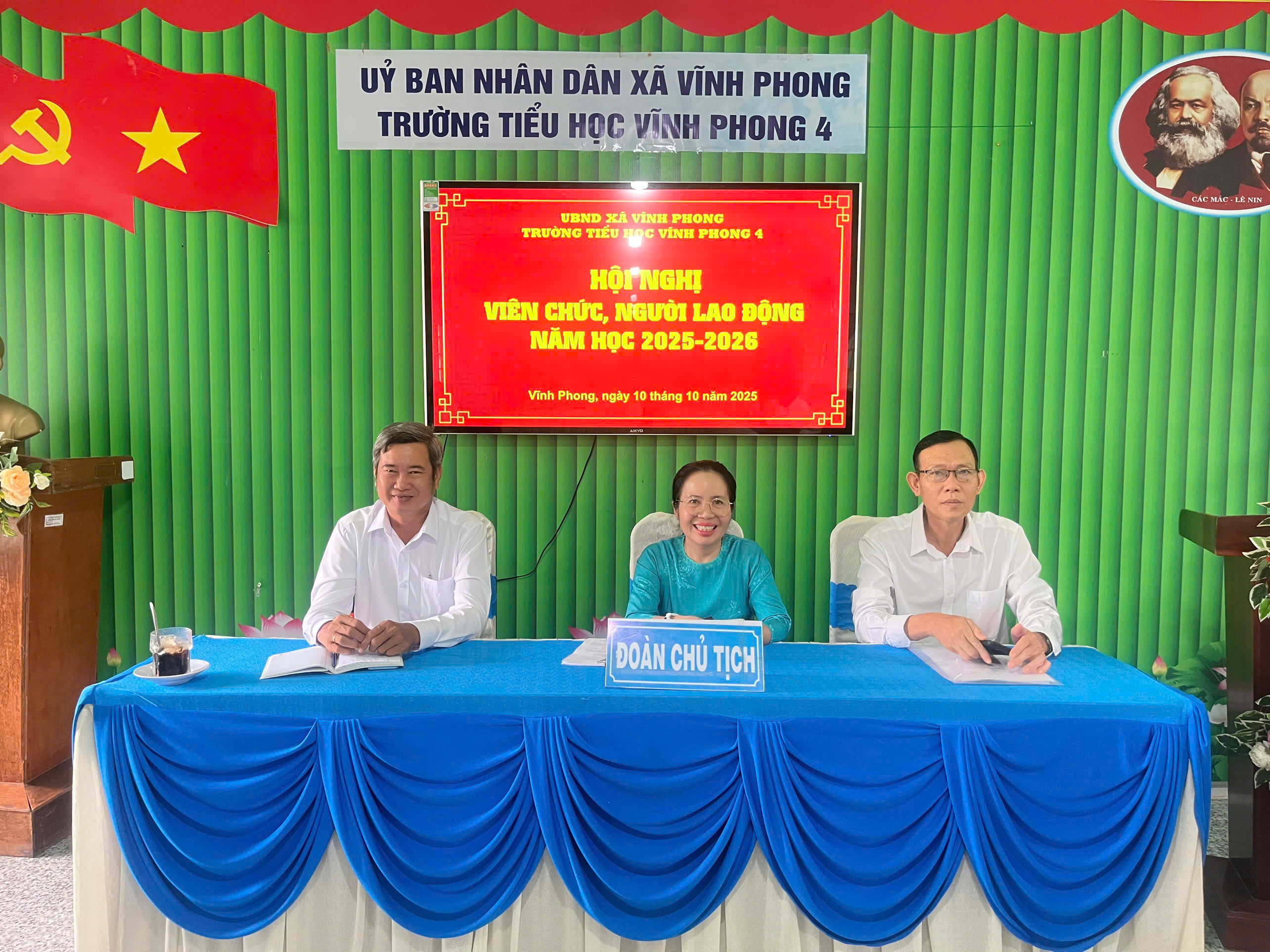 Hội nghị viên chức, người lao động năm học 2025-2026 của trường tiểu học Vĩnh Phong 4 đã thành công tốt đẹp. Hội nghị đã thông qua Nghị quyết với các nội dung: Đánh giá năm học 2024-2025; Đề ra phương hướng, chỉ tiêu năm học 2025-2026; Sự phối hợp giữa thủ trưởng cơ quan đơn vị với các bộ phận, đồng thời kêu gọi tập thể viên chức, người lao động trong nhà trường phát huy những thành tích đã đạt được, phấn đấu thực hiện thắng lợi nhiệm vụ chính trị, tích cực đóng góp công sức và trí tuệ xây dựng Nhà trường ngày một vững mạnh..
